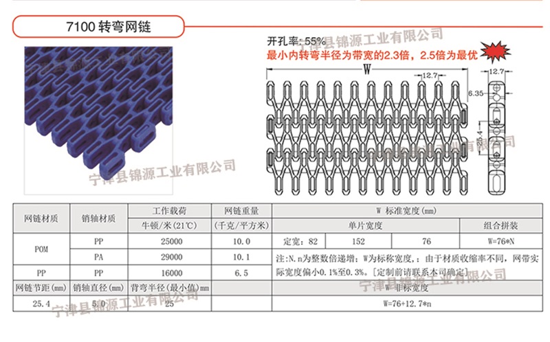 7100型轉彎網(wǎng)帶 開孔、平板、凸筋、滾珠、防滑形式,解決皮帶不跑偏,更換難等問題。