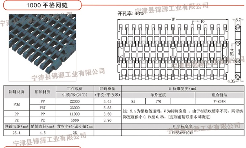 塑料網(wǎng)帶由鏈輪驅(qū)動(dòng),網(wǎng)帶節(jié)距主要有12.7mm、15.2mm、19.05mm、25.4mm、27.2mm、38.1mm、50.8mm、57.15mm,開(kāi)孔率2%-48%